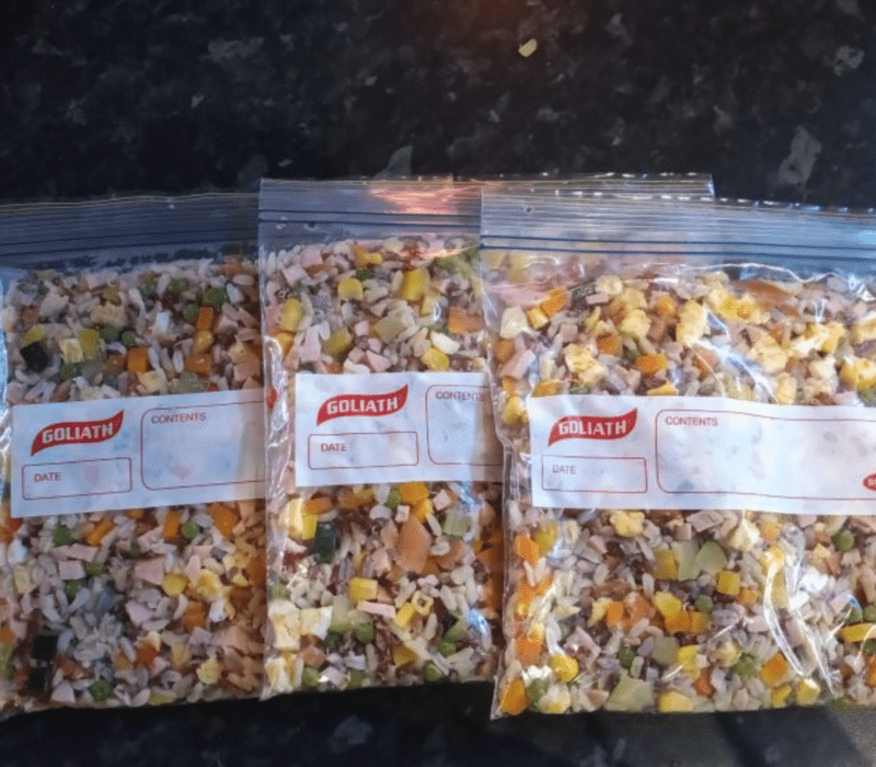 - Savoury Mince/Spag bowl/Fried Rice; once it has cooled I portion into zip lock bags and flatten it out to freeze so they take up hardly any space. Once thawed, I add some sauce and either a cup of ‘quick rice’ or spaghetti (for savoury mince or spag bowl. Again – this one is great for the whole family.